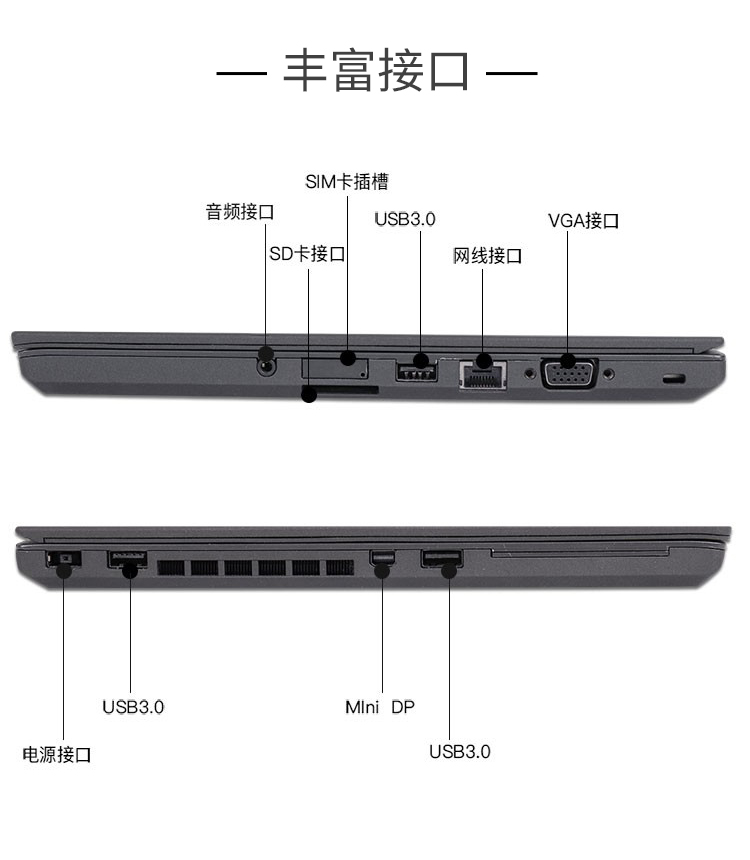 | 其他接口 : 三个USB3.0接口,VGA,mini displayport,耳机/麦克风二合一接口,RJ45,电源接口,多合一读卡器 |