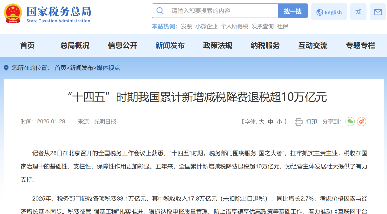 2026年1月28日召开的全国税务工作会议公布,“十四五”时期,全国累计新增减税降费退税超10万亿元。